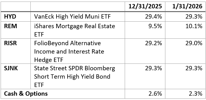 RISR produced a small negative return in January despite an increase in net asset value (NAV). This meant the price ended at a discount to NAV of around 0.35%. Interest rates were little changed over the month, as markets correctly predicted the Fed would hold the Fed Funds rate steady following a cumulative 175 bps in rate cuts from September 2024 through December 2025. Fed Chair Powell in his post meeting press conference repeated several times that the balance of risks between inflation and employment were more or less equal, so no additional policy adjustment was needed. This marked a distinct change in tone from earlier statements that labor markets were softening even as inflation held above the Fed’s 2% target. The actual job numbers released during the month were mixed, but the Fed chose to focus on how “the unemployment rate has shown some signs of stabilization.” It seems that the main indicator driving the decision was robust GDP growth that showed 4.4% annualized growth in Q4 2025.