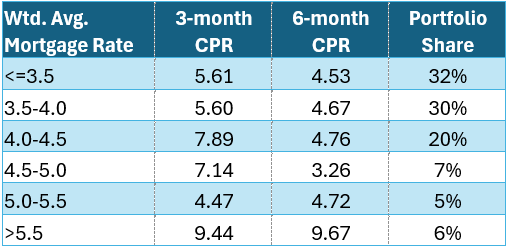 Prepayment speeds for our holdings remain very low by historical standards. The table below shows the 3-month and 6-month prepayment rates [1] by underlying pool mortgage rate.