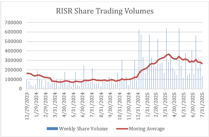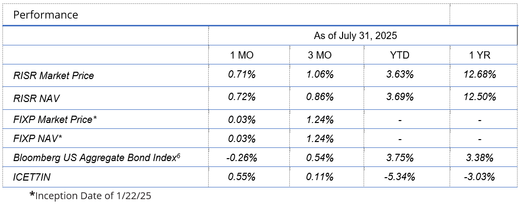 We are very pleased with the growth in the fund’s assets and trading volumes, and we are grateful for the confidence investors have placed in RISR. This performance has maintained RISR’s standing among the Alternative Bond Funds tracked by Morningstar where it holds the #2 position out of 253 funds for the 3-year period ended 7/31/25, based on total return.