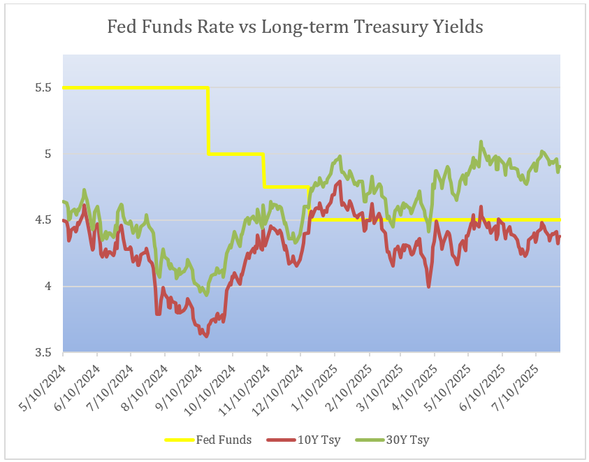 Will they or won’t they? Some days it seems the only topic of discussion in the market is when the Fed will cut rates and by how much. President Trump has made it abundantly clear he believes they should have begun cutting rates long ago, and he has advocated for a Fed Funds rate that is as low as 1-2%, as compared to 4.5% currently. The last rate cut was made in December of 2024. Since then, the Fed has decided to wait for additional clarity on the impact tariffs may have on inflation, among other factors. That task has been made exceedingly difficult due to the ever-changing announcements about tariff levels and timing, and which countries and products will be subject to tariffs.