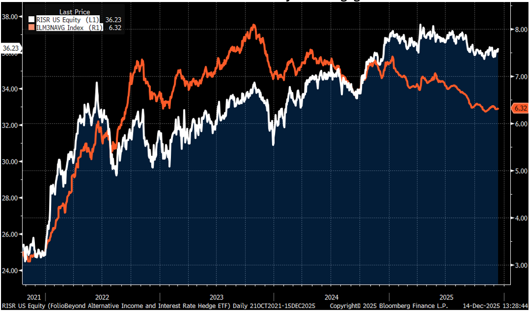 Since its inception in 2021, RISR has tracked interest rates and the broad bond market, almost exactly as designed. During periods where interest rates have increased, RISR has tended to increase in value. But even during periods of falling rates, RISR has held its value, and produced positive returns from interest income. While mortgage rates have come down by more than 100 bps so far in 2025, RISR’s YTD total return has been positive 3.12%.