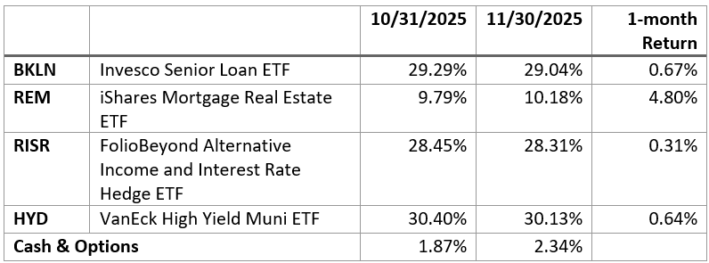 For the month of November, FIXP returned 1.17% (1.07% based on NAV), to bring the YTD return to 4.42%. There were no portfolio reallocations during the month, but weightings changed slightly due to differential performance.