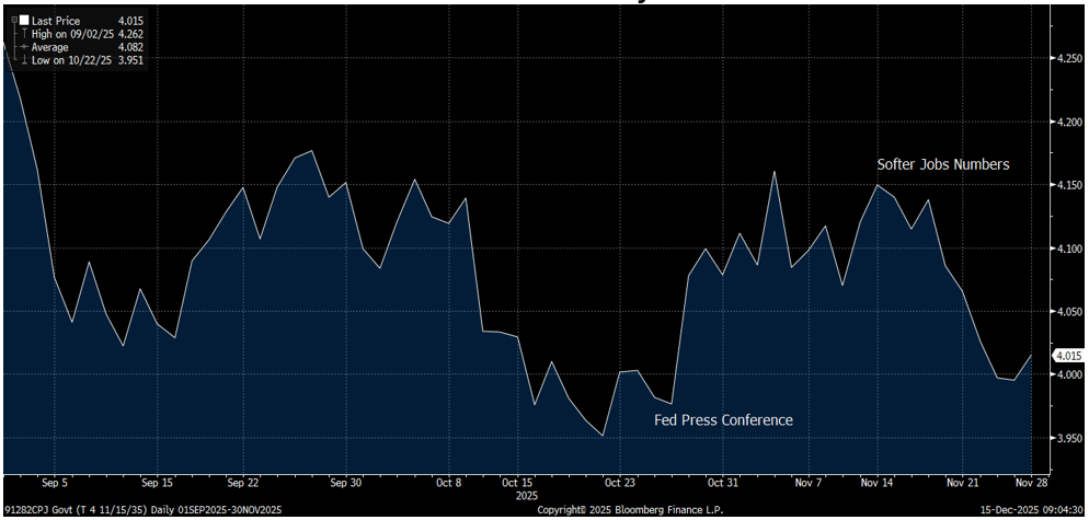 When the Fed last cut on October 29, Chair Jay Powell in his press conference emphasized that the economic picture was particularly unclear, and made even more obscure by the government shutdown. He further went out of his way to state multiple times that future rate cuts were not a certainty. Initially this had the effect of pushing rates up immediately following Powell’s statements. Just few weeks later as numbers indicating continued labor market softening this selloff was nearly fully reversed as “Fed will cut” bets came back to the fore.
