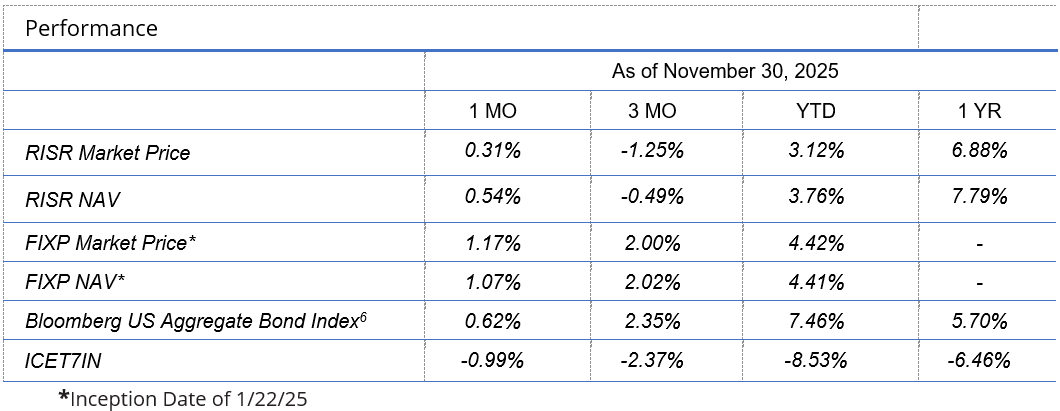 The FolioBeyond Alternative Income and Interest Rate Hedge ETF (ticker: RISR) returned 0.31% based on the closing market price (0.54% based on net asset value or “NAV”) in November. In comparison, the ICET7IN Index (US Treasury 7-Year Bond Inverse Index) returned -0.99% while the Bloomberg Barclays U.S. Aggregate Bond Index ("AGG") returned 0.621% during the same period.
