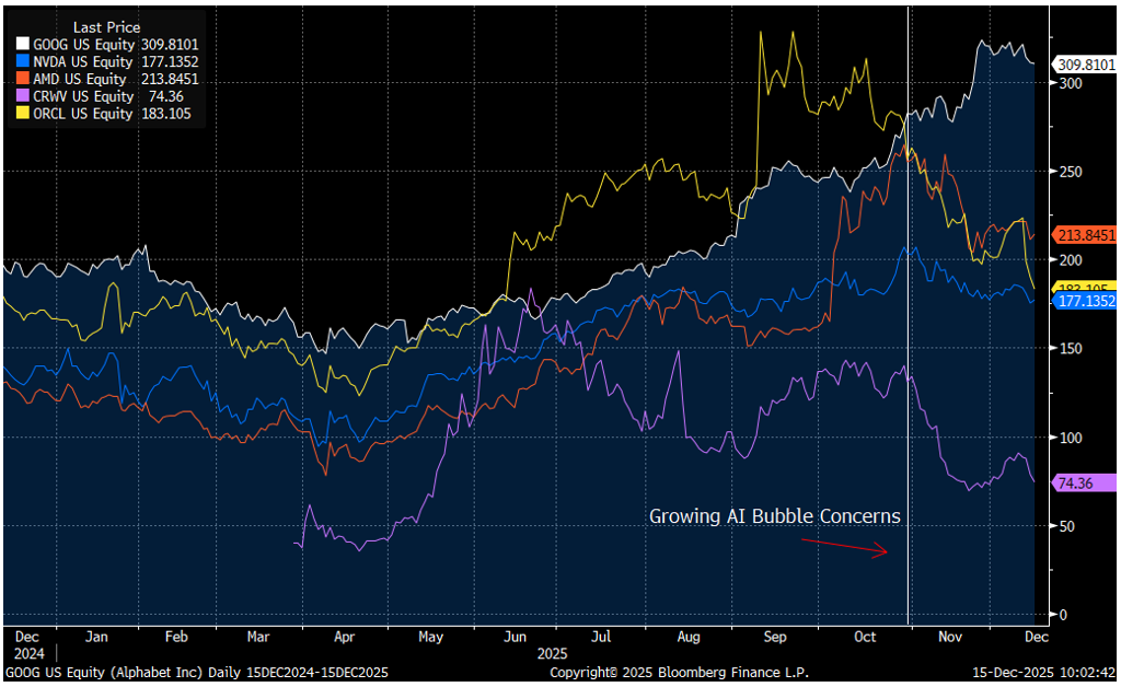 In response to this growing concern, equity prices from the major public AI-related stocks have seen pullbacks, including NVIDIA, AMD, Google, Oracle. Until recently, it was all “up and to the right” for this sector.